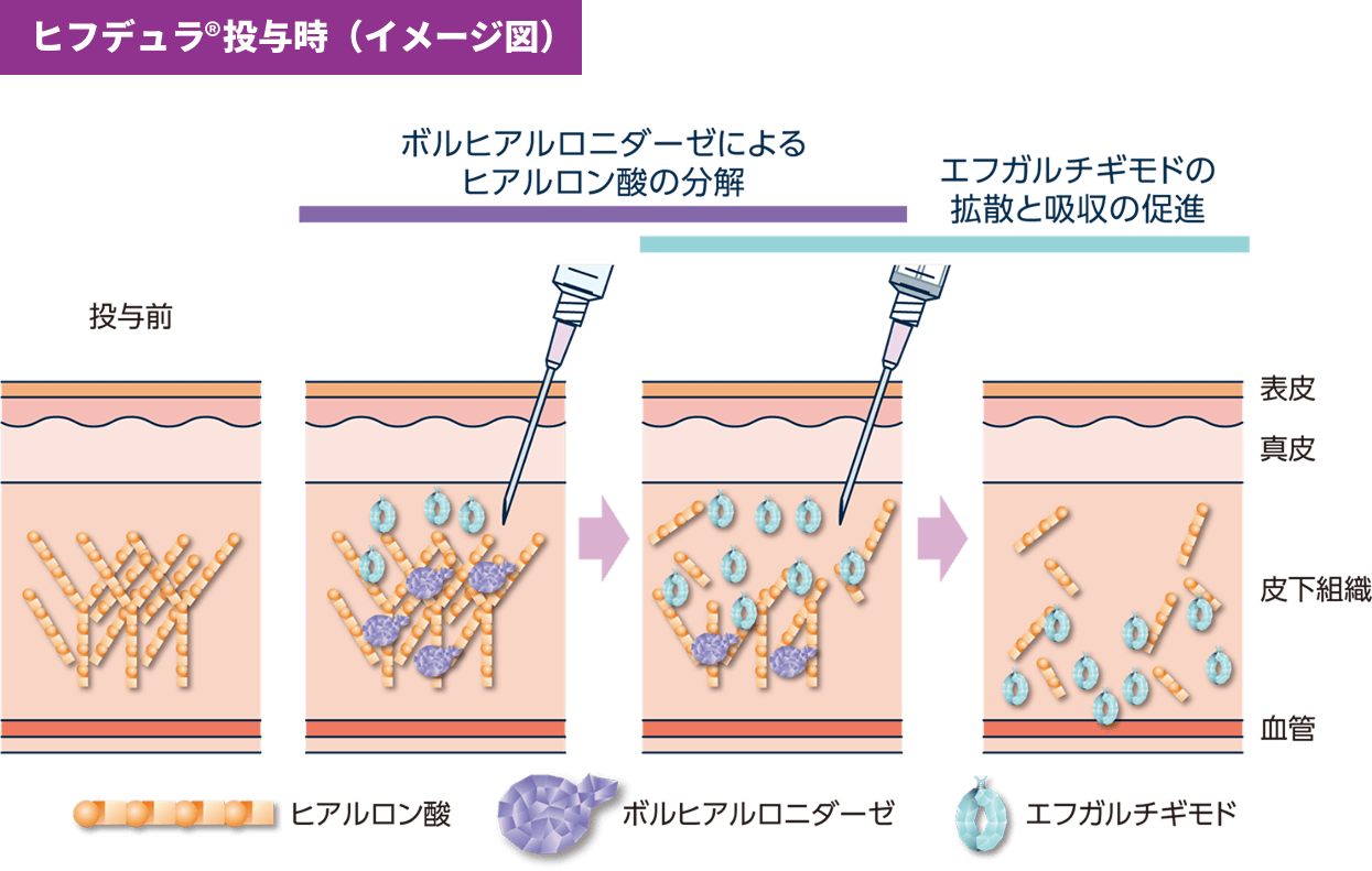 ※ボルヒアルロニダーゼのはたらきにより、からだの中に広がった有効成分エフガルチギモドを「ヒフデュラ®︎」として記載しています。
